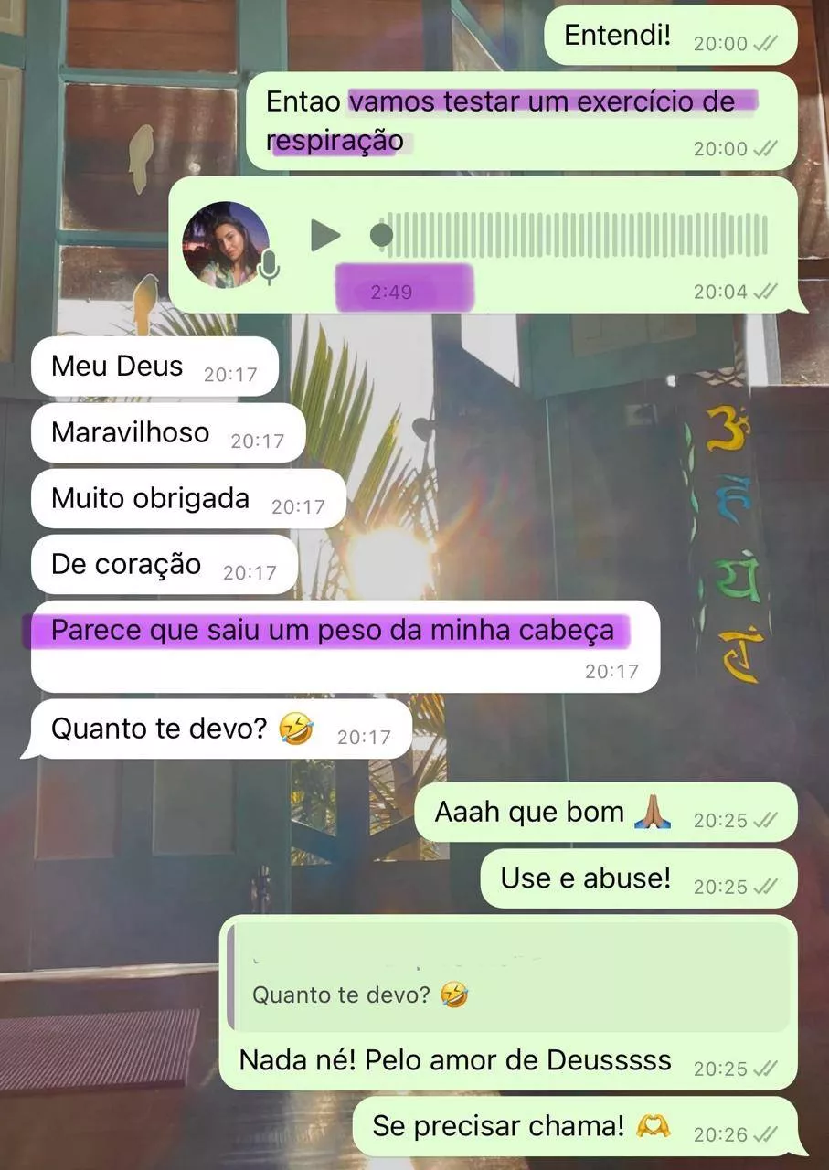 Sempre que precisar, é só me chamar! Estarei disponível para orientar, tirar dúvidas, criar práticas e ajustar seu caminho para que sua prática seja realmente transformadora.